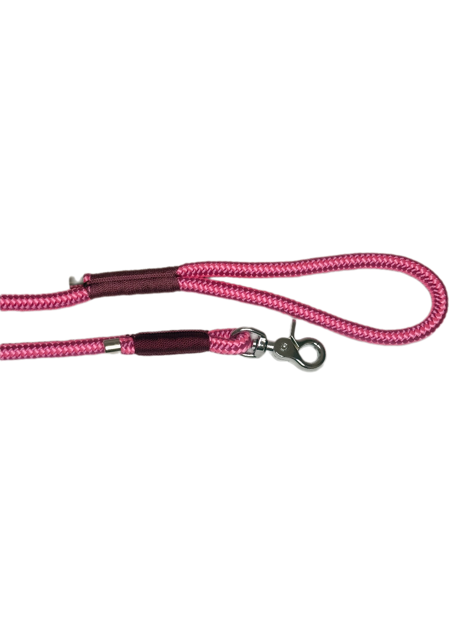 A Berry Glow Póráz kézzel készült, 10 mm vastag pink–bordó kutyapóráz, erős karabinerrel és kényelmes fogantyúval.